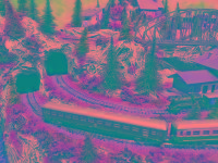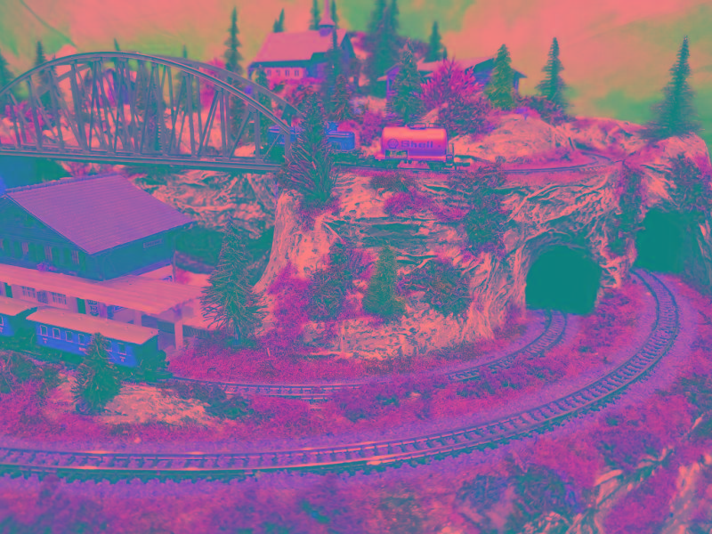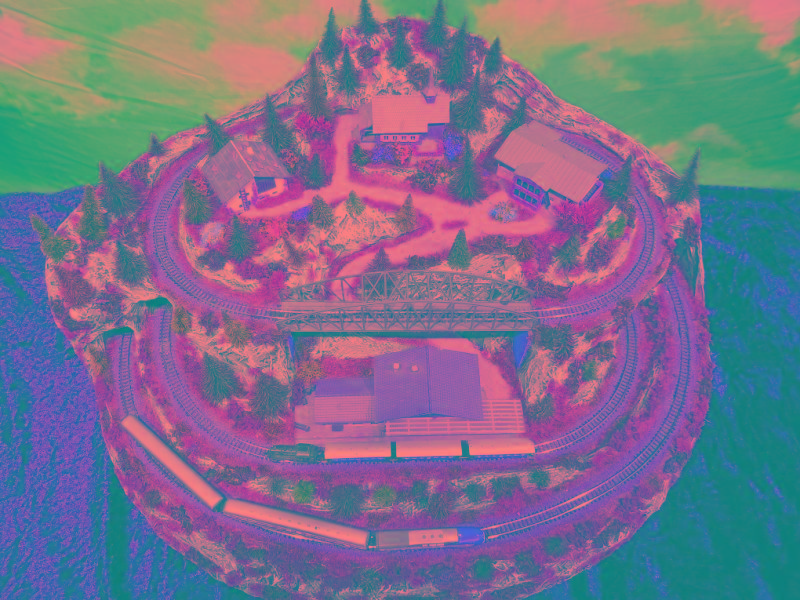 Das untere Gleis ist wie gewohnt als Endlos-Schleife (verschlungene Acht) verlegt und passiert dadurch zwei Ebenen.
