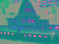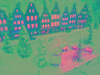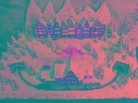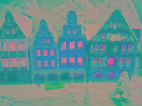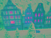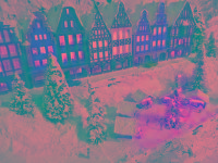 Dahinter auch noch eine Art von Alpenkulisse. Des Weiteren ein niedlicher Weihnachtsmarkt deren Marktbuden ebenfalls idyllisch beleuchtet sind.