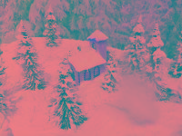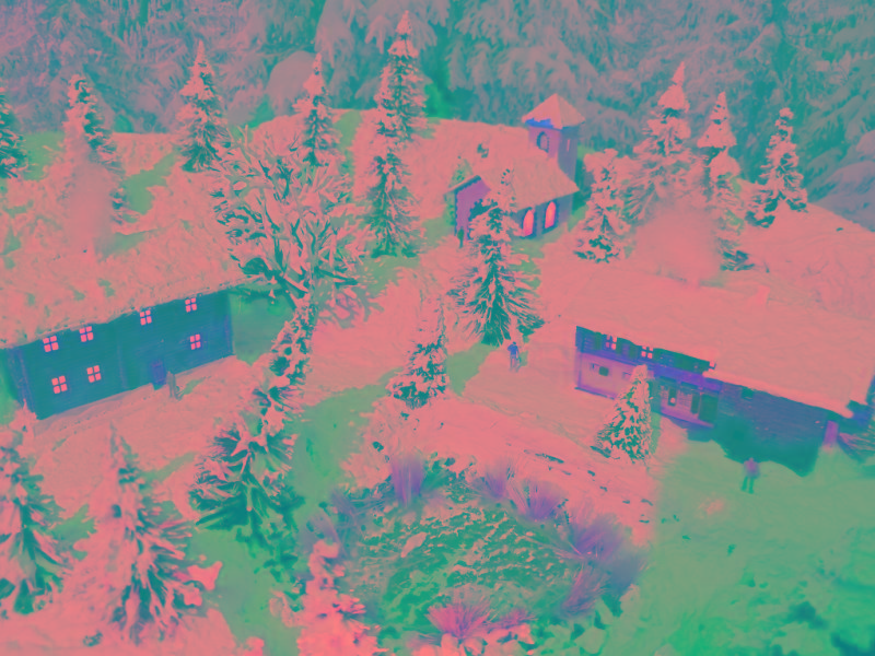 Schöne Winterwelt mit glitzerndem Schnee und LED beleuchtete Häuser.