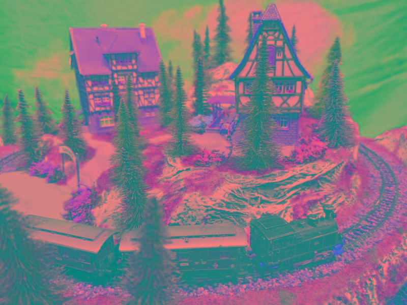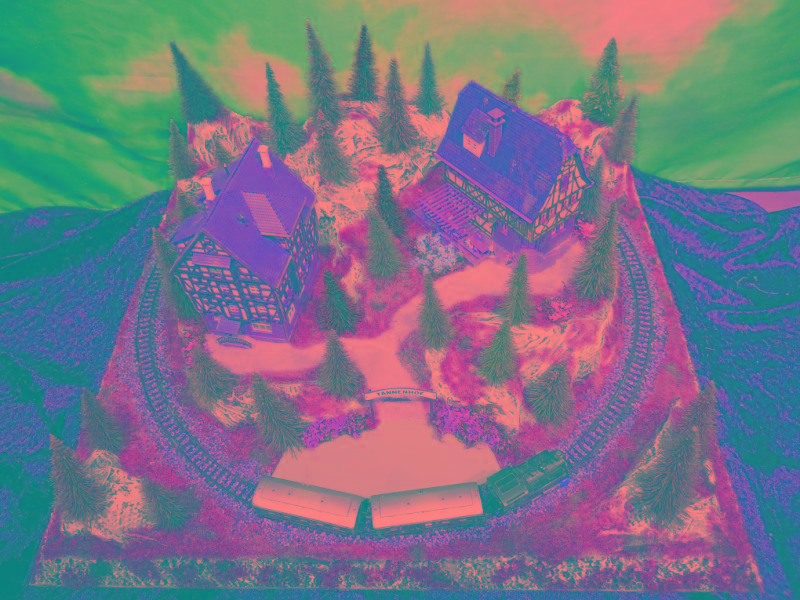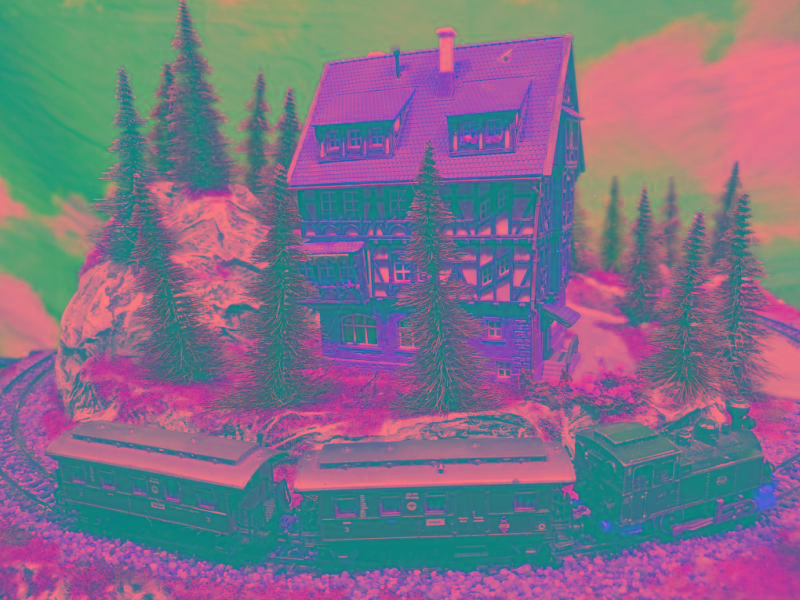 Ein Gasthof lädt bei Speis und Trank zum Verweilen ein. Der Zug bringt und holt dazu immer wieder neue oder gesättigte Gäste.