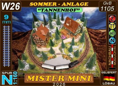 Nette Sommer-Anlage "TANNENHOF" auf quadratischer Grundfläche mit LED beleuchteten Fachwerk-Häusern, die sich in einer leicht bergigen Landschaft befinden.