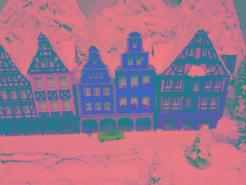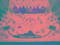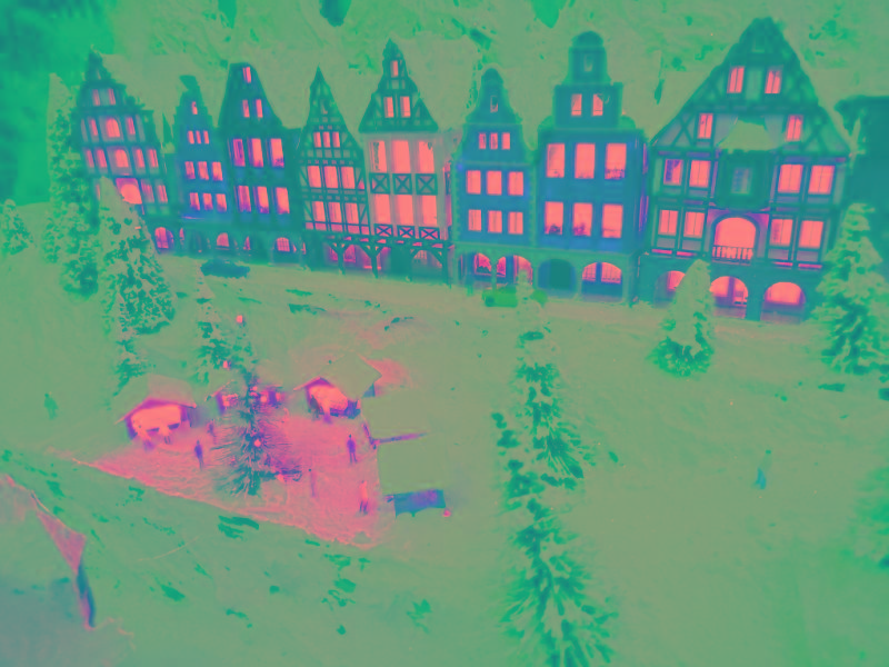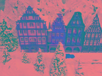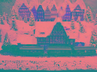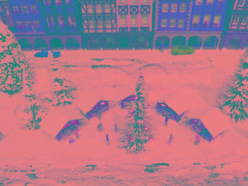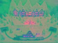 Dahinter auch noch eine Art von Alpenkulisse. Des Weiteren ein niedlicher Weihnachtsmarkt deren Marktbuden ebenfalls idyllisch beleuchtet sind.