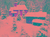 Schöne Winter-Rund-Anlage "WINTERDORF" mit LED beleuchteten Gebäuden, die sich in einer leicht bergigen Landschaft mit glitzernden