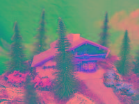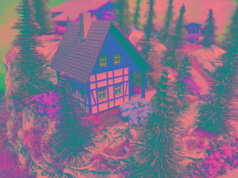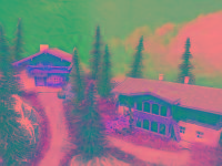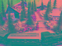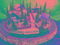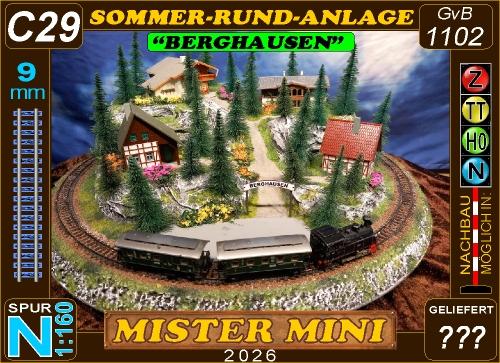 Traumhafte Sommer-Anlage auf runder Grundfläche mit LED beleuchteten Gebäuden, die sich in einer leicht bergigen