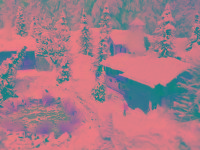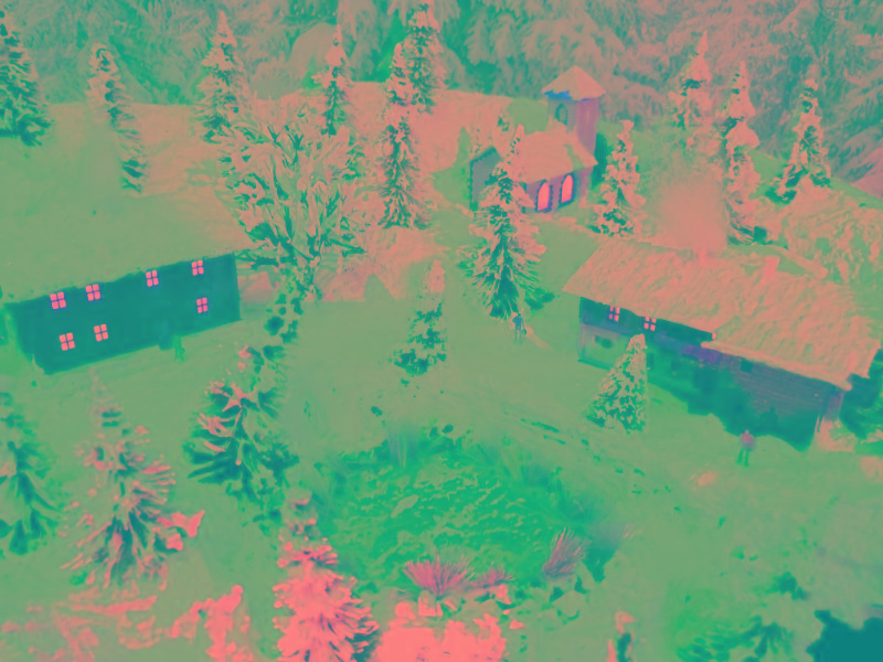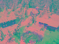 Schöne Winterwelt mit glitzerndem Schnee und LED beleuchtete Häuser.