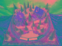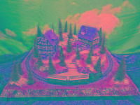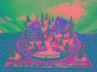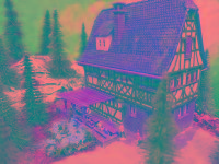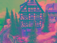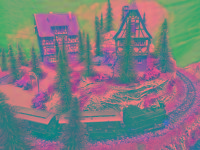 Nette Sommer-Anlage "TANNENHOF" auf quadratischer Grundfläche mit LED beleuchteten Fachwerk-Häusern, die sich in einer leicht bergigen Landschaft befinden.
