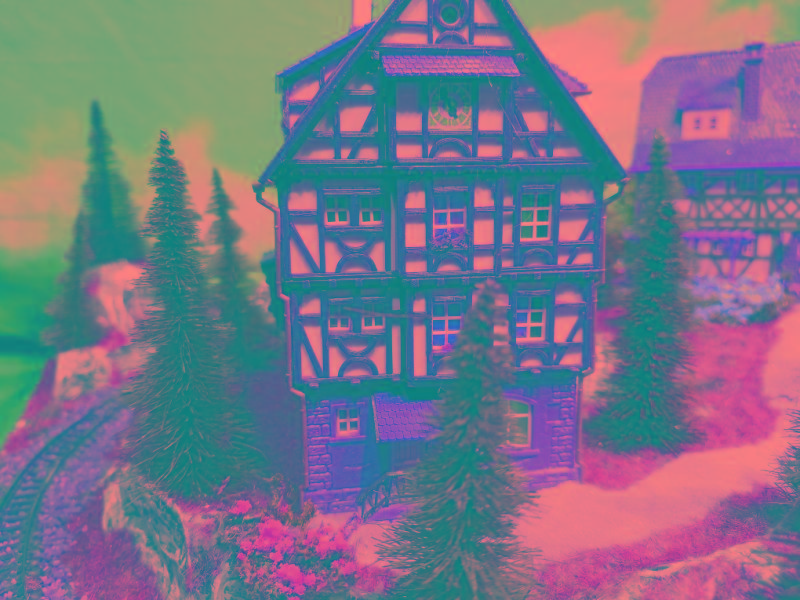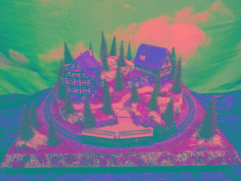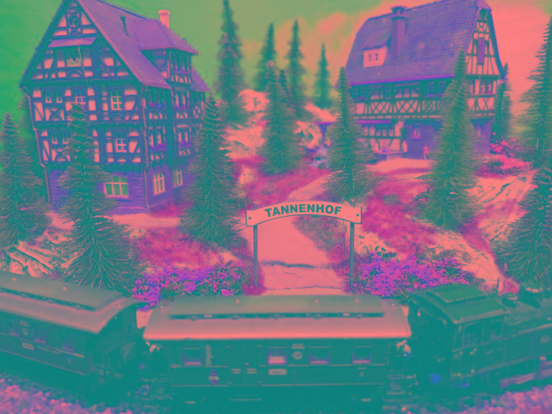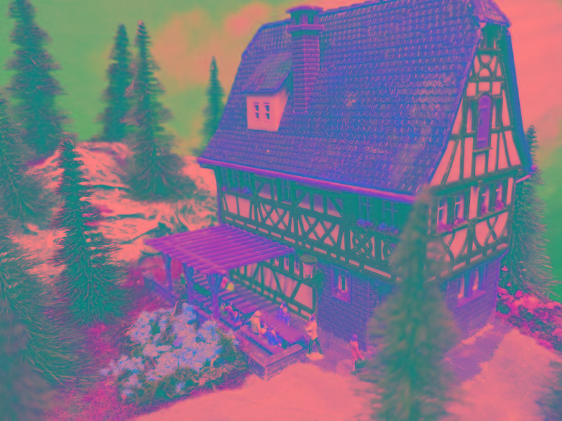 Ein Gasthof lädt bei Speis und Trank zum Verweilen ein. Der Zug bringt und holt dazu immer wieder neue oder gesättigte Gäste.