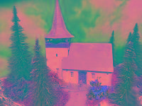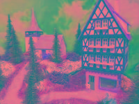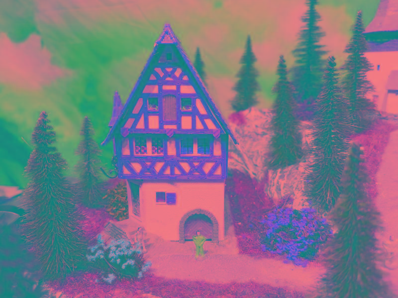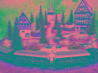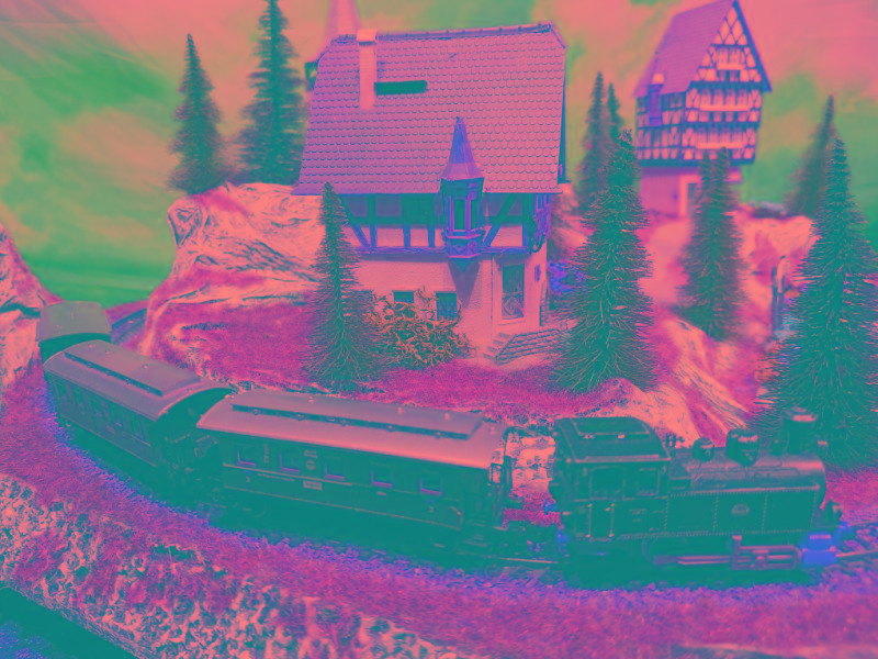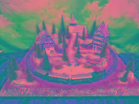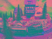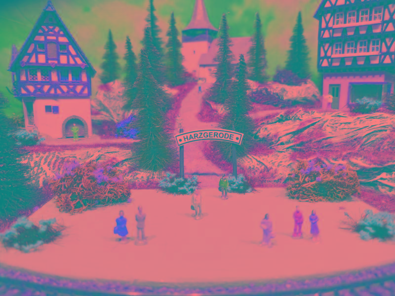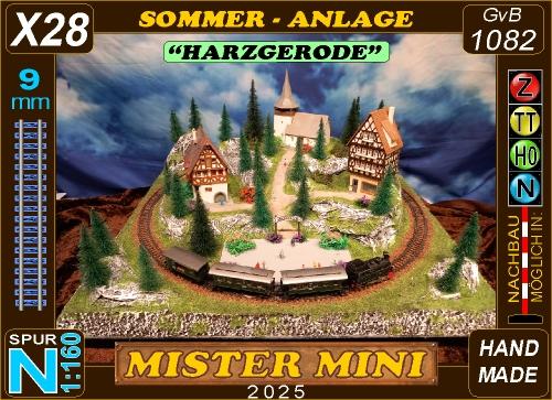Schöne Sommer-Anlage auf quadratischer Grundfläche mit Haltepunkt "HARZGERODE" und beleuchteten Gebäuden.